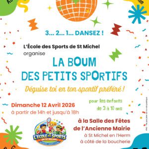 A partir de 14h, jusqu’à 18h, organisée par l’école des Sports de St Michel. Salle des Fêtes (Derrière la boucherie). Déguise toi en ton sportif préféré ! Jeux, animations, maquillage, barbe à papa, accessoires fluos… Tarif : 5€ (Crêpe+boisson) gratuit pour les accompagnants. Inscription : 06 59 93 36 73.