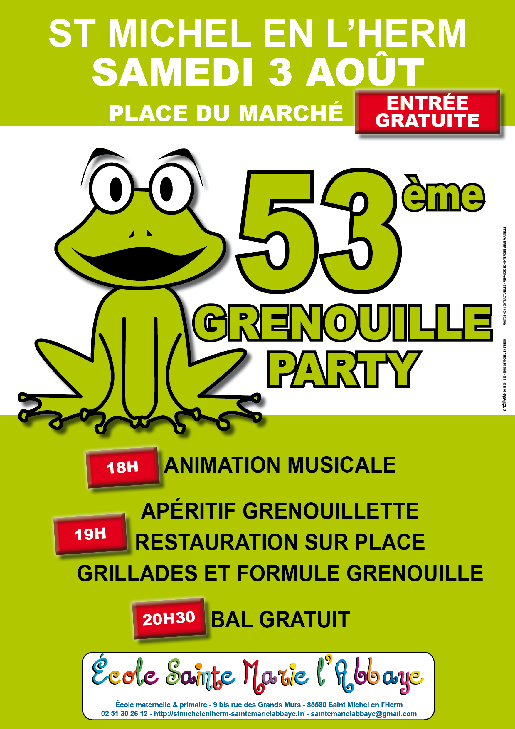 53ème Grenouille PartyOrganisée par l’APEL.18h : Animation musicale19h : Apéritif Grenouillette, buvette et restauration sur place, grillades et formule Grenouilles20h30 : Bal gratuit. Place du marché.+ Ajouter à mon Agenda Google+ iCal / Outlook export Date03 Août 2024Expiré! Heure 18h00 - 23h00Partagez cet événement