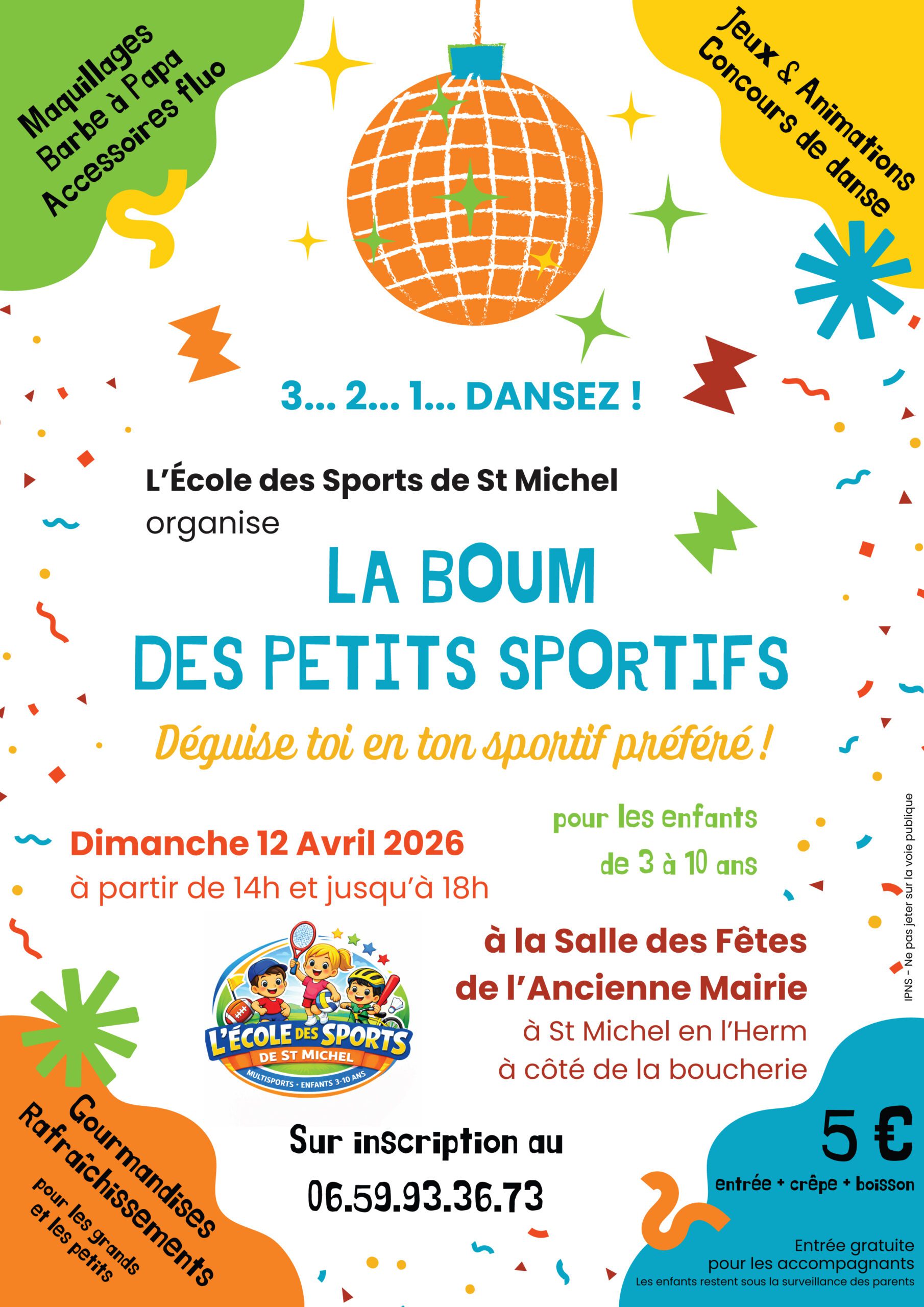 A partir de 14h, jusqu’à 18h, organisée par l’école des Sports de St Michel. Salle des Fêtes (Derrière la boucherie). Déguise toi en ton sportif préféré ! Jeux, animations, maquillage, barbe à papa, accessoires fluos… Tarif : 5€ (Crêpe+boisson) gratuit pour les accompagnants. Inscription : 06 59 93 36 73.