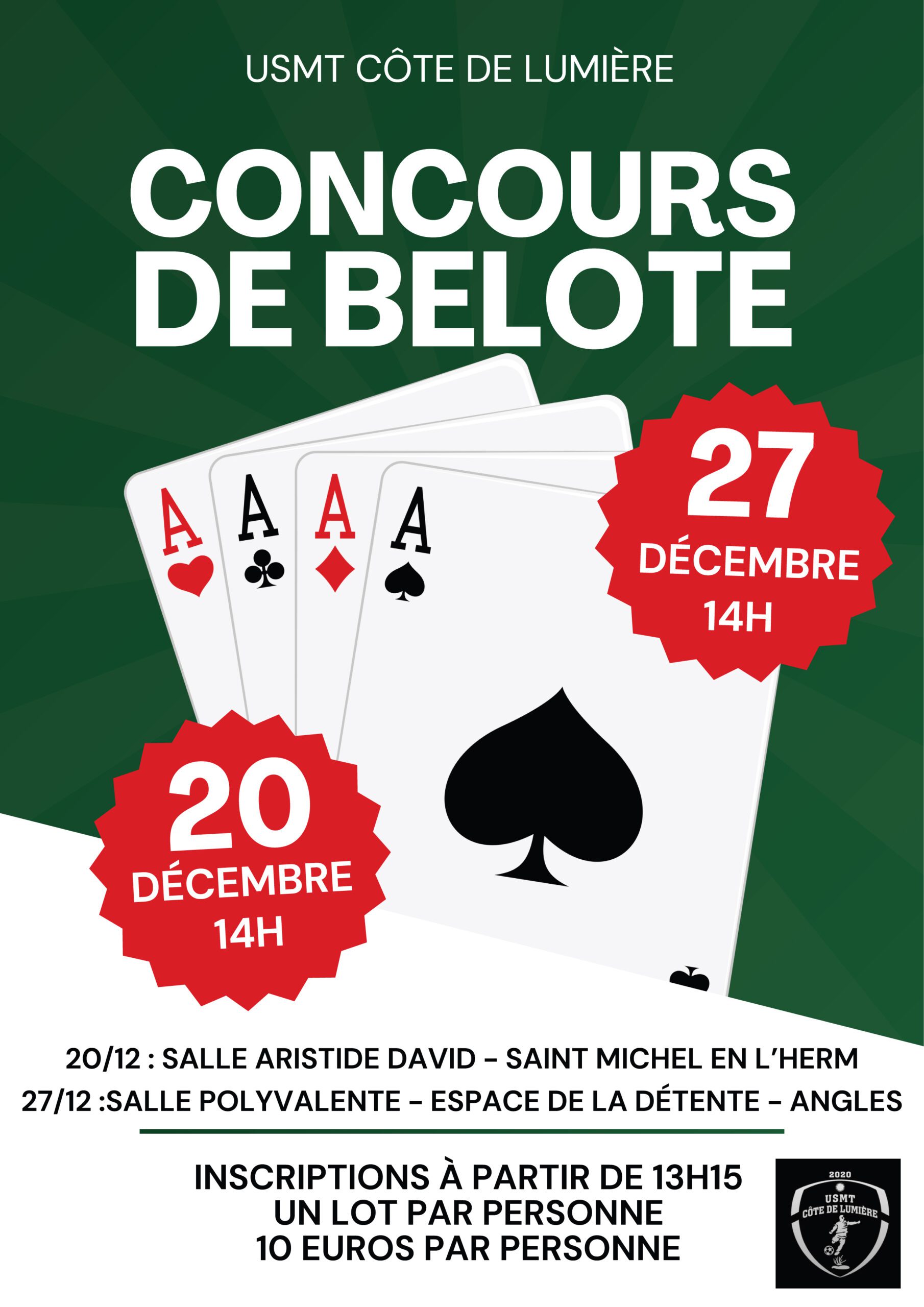 Concours de beloteOrganisé par l’USMT Foot, salle A. David. Tarif : 10€, 1 lot par participant.Salle Aristide David à St Michel+ Ajouter à mon Agenda Google+ iCal / Outlook export Date20 Déc 2025 Heure 13h15 - 19h00Partagez cet événement
