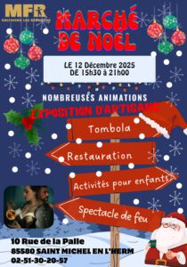 Marché de Noël de la MFR10 rue de La Palle à St Michel. Exposants, animations et restauration sur place. Spectacle de feu, tombola. + Ajouter à mon Agenda Google+ iCal / Outlook export Date22 Nov 2025Expiré! Heure 8h00 - 18h00Partagez cet événement