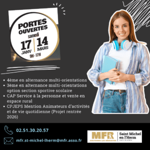 MFR Portes ouvertesLa MFR de St Michel ouvre ses portes de 9h à 17h.Rue de la PalleRenseignements au 02 51 30 20 57 – mfr.st-michel-lherm@mfr.asso.fr+ Ajouter à mon Agenda Google+ iCal / Outlook export Date17 Jan 2026 Heure 9h00 - 17h00Partagez cet événement