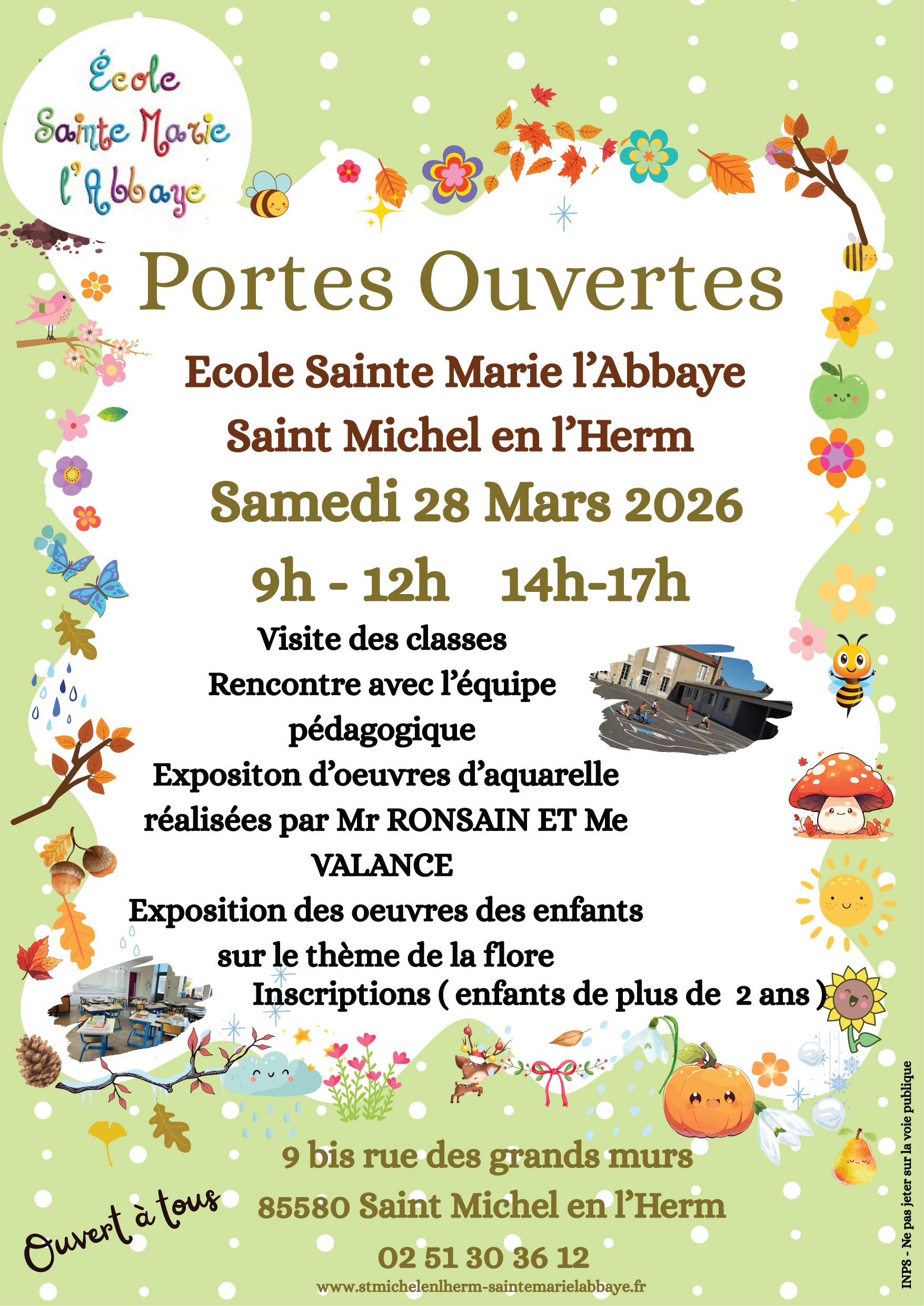 Portes ouvertes école Ste Marie l’AbbayeDe 9h à 12h et de 14h à 16h30, exposition d’aquarelles et des œuvres des enfants de l’école. Inscription dès 2 ans et renseignements au 02-51-30-26-12.Rue des Grands Murs à St Michel+ Ajouter à mon Agenda Google+ iCal / Outlook export Date28 Mar 2026 Heure 9h00 - 16h30Partagez cet événement
