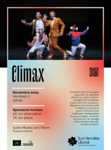 Spectacle « Climax »Interprété par la compagnie Zygomatic, un mariage entre comique absurde, humour grinçant ! Sur réservation Sud Vendée Littoral : 5€ et 7€ sur place.Espace Culturel, allée des Arts à St Michel en l’Herm+ Ajouter à mon Agenda Google+ iCal / Outlook export Date07 Nov 2025Expiré! Heure 20h30 - 22h30Partagez cet événement