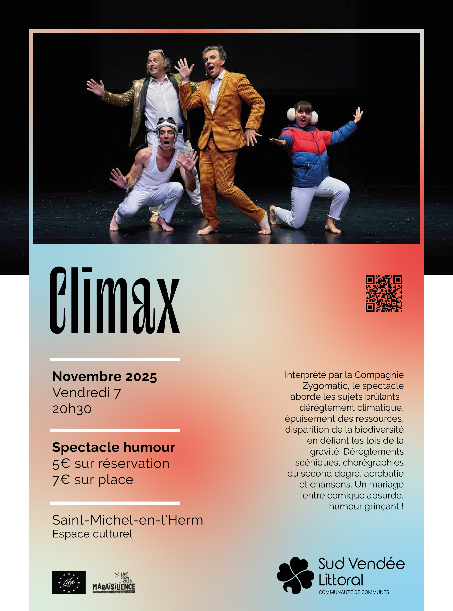 Spectacle « Climax »Interprété par la compagnie Zygomatic, un mariage entre comique absurde, humour grinçant ! Sur réservation Sud Vendée Littoral : 5€ et 7€ sur place.Espace Culturel, allée des Arts à St Michel en l’Herm+ Ajouter à mon Agenda Google+ iCal / Outlook export Date07 Nov 2025 Heure 20h30 - 22h30Partagez cet événement