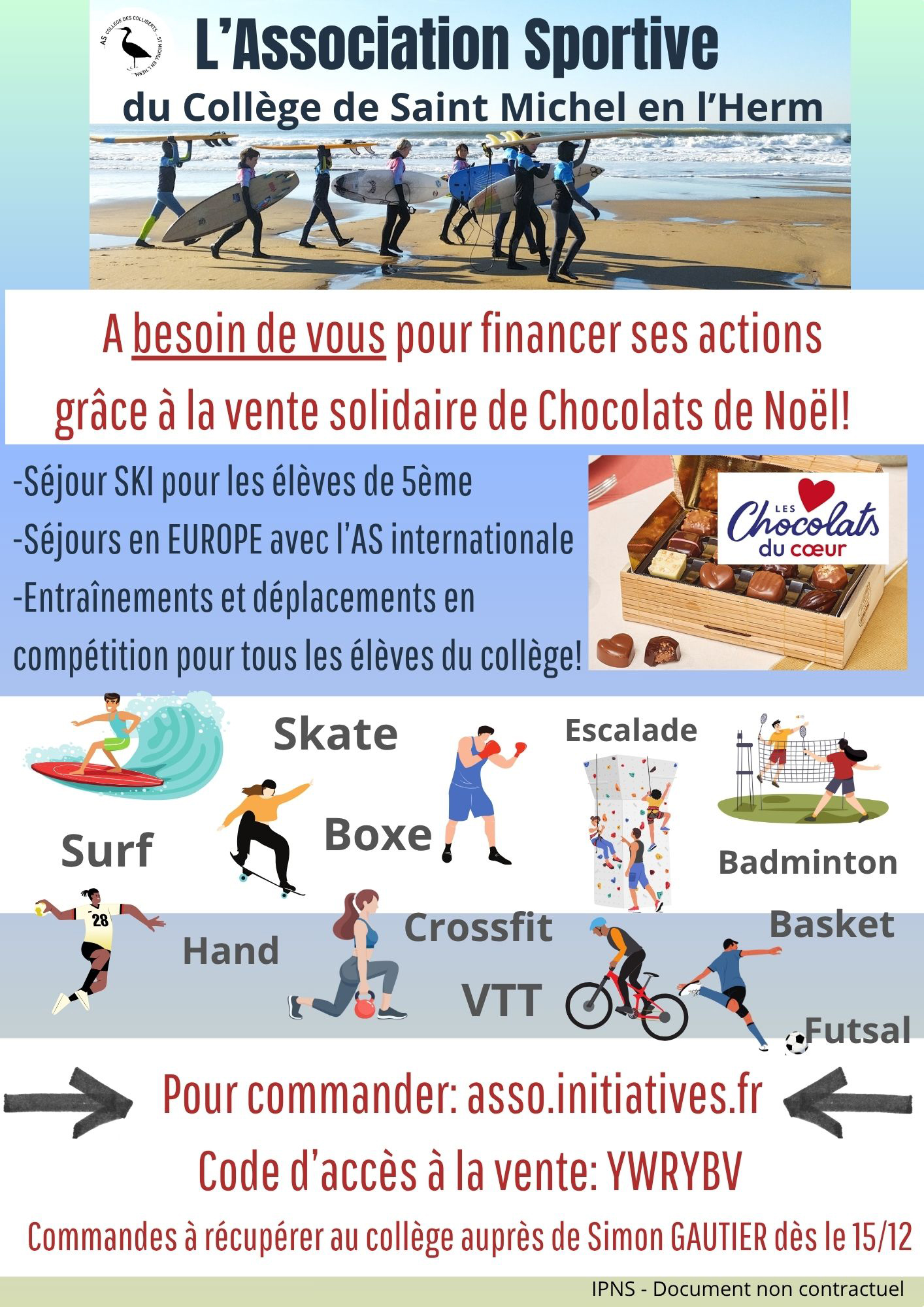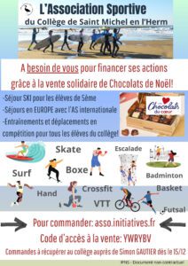 L’association sportive du collège Les Colliberts à St Michel a besoins de vous pour aider à financer ses actions, grâce à la vente solidaire de chocolats de Noël.
