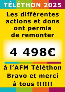 Téléthon 2025 – 4 498€ !!!! par Mairie | samedi, 31 janvier, 2026 | Vie communeLes différentes actions et dons ont permis de remonter 4 498€ à l’AFM Téléthon. Bravo et merci à tous !!!!!!